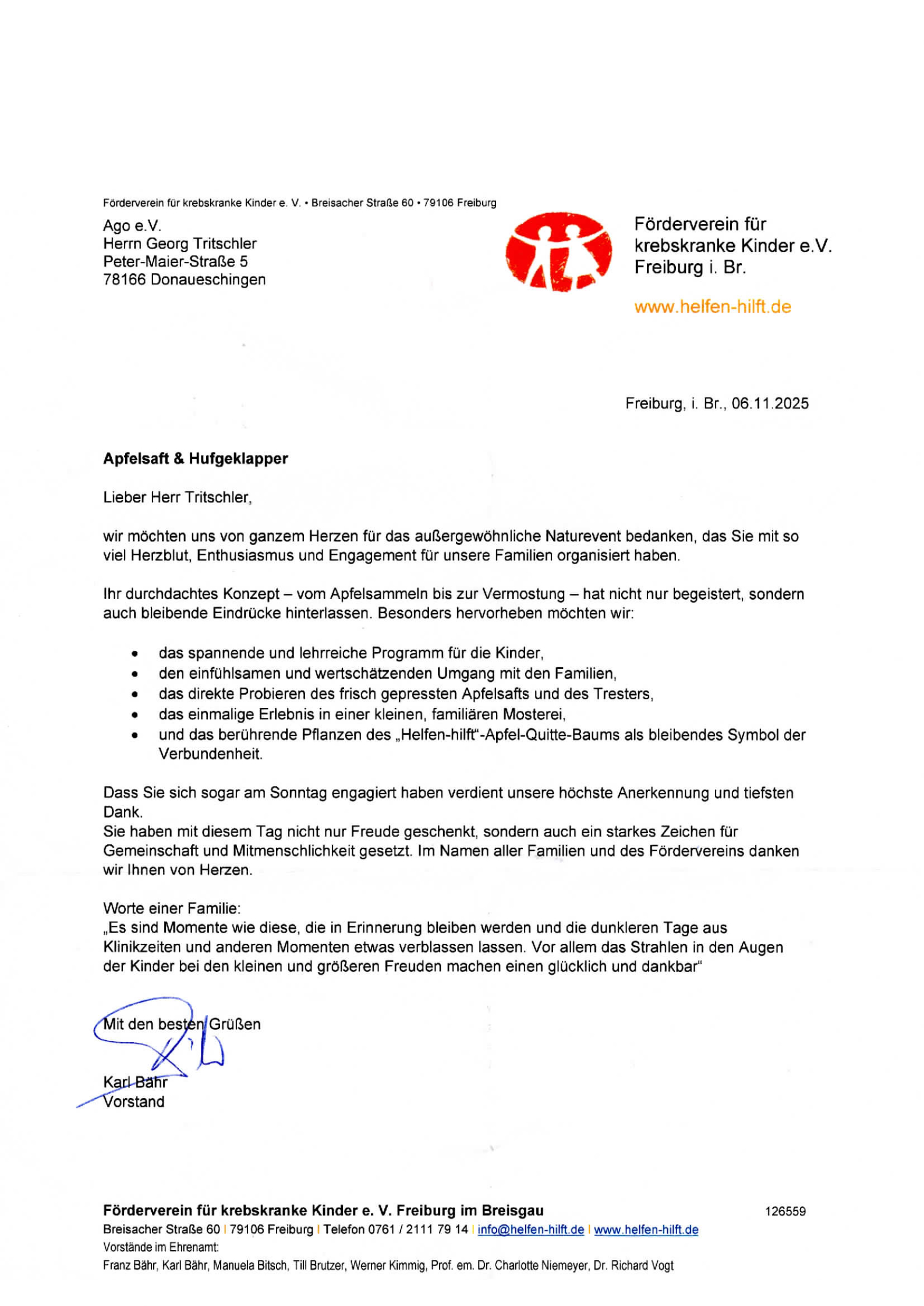 Danksagung des Förderverein Krebskranker Kinder e.V. 11/2025